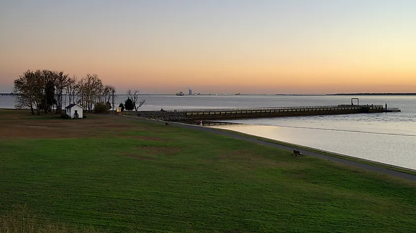 Front de mer du parc national de Fort Mott, vue sur le coucher du soleil avec le fleuve Delaware en arrière-plan, canton de Pennsville, New Jersey.