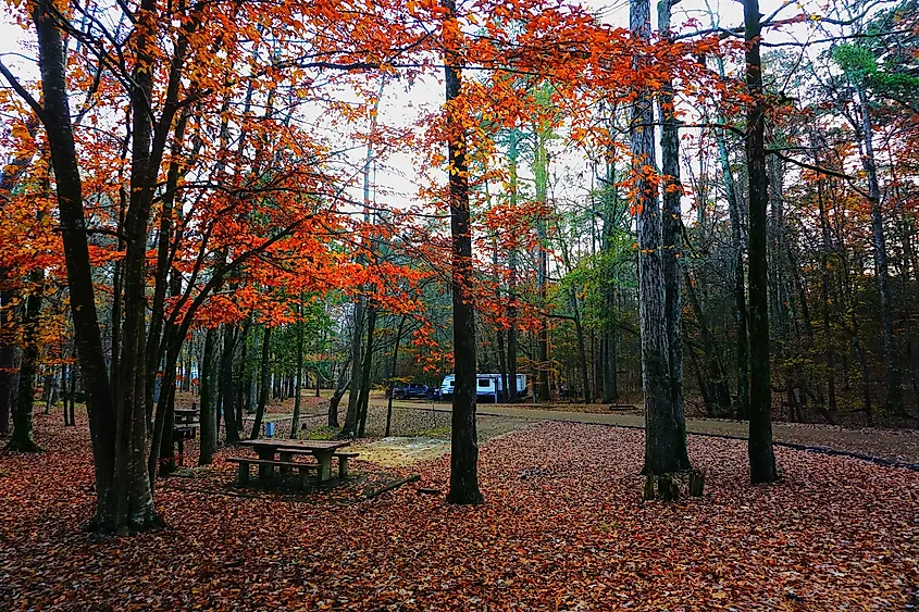 La vaste forêt nationale de Holly Springs ajoute au spectacle avec son mélange de feuillus et de pins, offrant des possibilités infinies de routes panoramiques et de promenades tranquilles sous la canopée changeante. Pour une perspective unique, le Strawberry Plains Audubon Centre allie histoire et nature, où les sentiers serpentent le long des étangs, des prairies de fleurs sauvages et des forêts de feuillus aux teintes automnales.