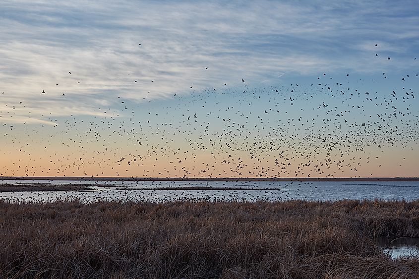 Les merles migrateurs affluant au-dessus des zones humides de Cheyenne Bottoms au coucher du soleil se découpent sur le ciel orange.