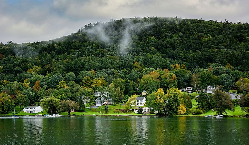 Bâtiments et bateaux au bord du lac le long de la côte du lac Skaneateles à New York. Crédit éditorial : PQK / Shutterstock.com