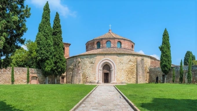 À environ 15 minutes de marche au nord-ouest du centre de la vieille ville, vous rencontrerez l'église Sant'Angelo, la plus ancienne église de Pérouse. La structure ronde en pierre se dresse seule sur une pelouse herbeuse et se distingue par son aspect charmant. L'église a été construite entre le Ve et le VIe siècle, ce qui en fait l'une des plus anciennes églises d'Italie. Son plafond en forme de dôme est soutenu par huit poutres, elles-mêmes soutenues par seize piliers disposés en cercle.