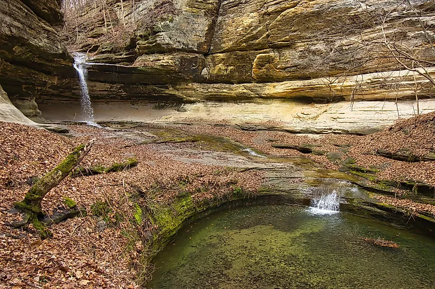 Situé le long de la rivière Illinois, près d’Oglesby, le Starved Rock State Park est l’un des sites naturels les plus visités de l’État. Le parc comprend 18 canyons profonds creusés par l'eau de fonte des glaciers, avec un certain nombre de cascades particulièrement actives au printemps et après de fortes pluies. Plus de 13 miles de sentiers peuvent être explorés dans et autour des canyons, menant à travers d'autres sites immaculés, comme des falaises boisées et à des points de vue panoramiques tels que Lover's Leap et Eagle Cliff. La région est également connue pour abriter de nombreuses populations de pygargues à tête blanche pendant les mois d'hiver, attirant les ornithologues amateurs de tout le Midwest.