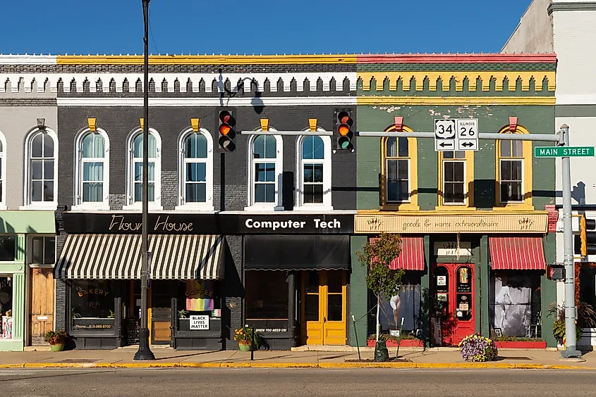 Vieux bâtiments en briques colorés et devantures de magasins dans le centre-ville de Princeton, Illinois.