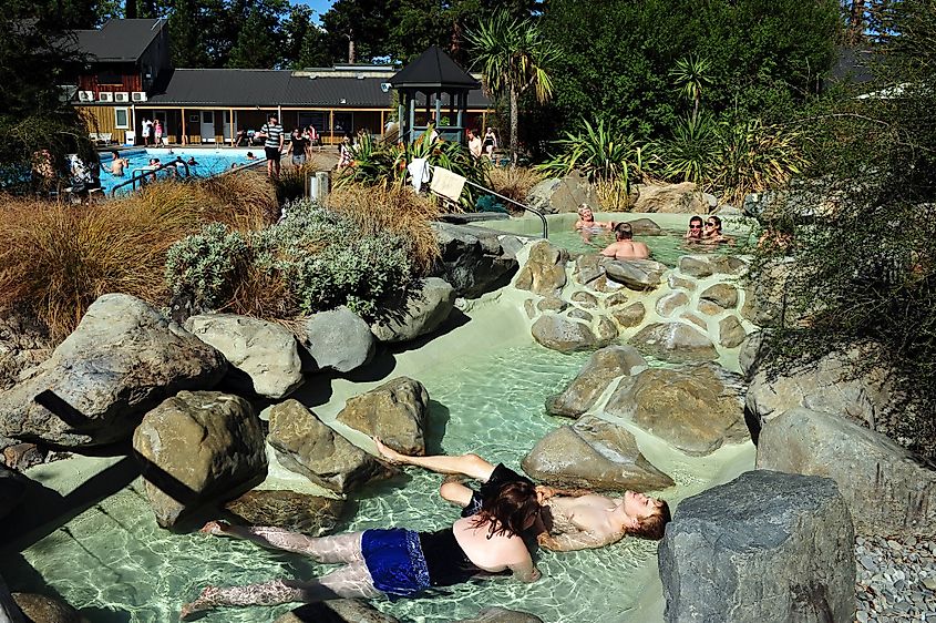 Les touristes profitent et se détendent dans les piscines chaudes de Hanmer Springs.