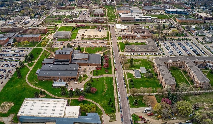 Vue aérienne du campus de l’Université Vermillion du Dakota. Crédit image Jacob Boomsma via Shutterstock.