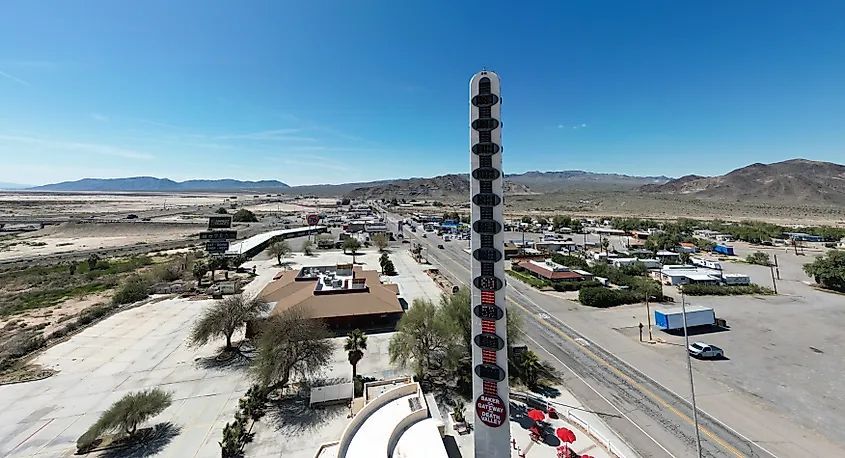 Le thermomètre le plus haut du monde à Baker, en Californie. Crédit image Gerald Peplow via Shutterstock