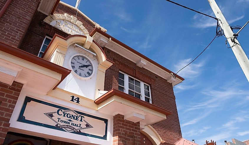 Façade avec horloge de l'hôtel de ville de Cygnet dans le sud de la Tasmanie. Crédit image Henk Vrieselaar via Shutterstock.