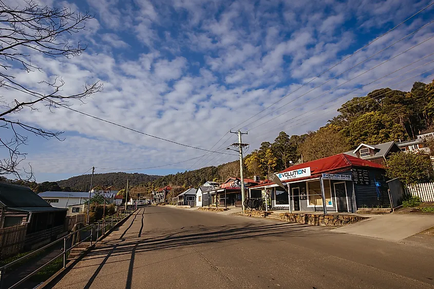 Architecture de bâtiment minier emblématique dans la ville rurale de Derby, Tasmanie, Australie. Crédit éditorial : FiledIMAGE / Shutterstock.com.