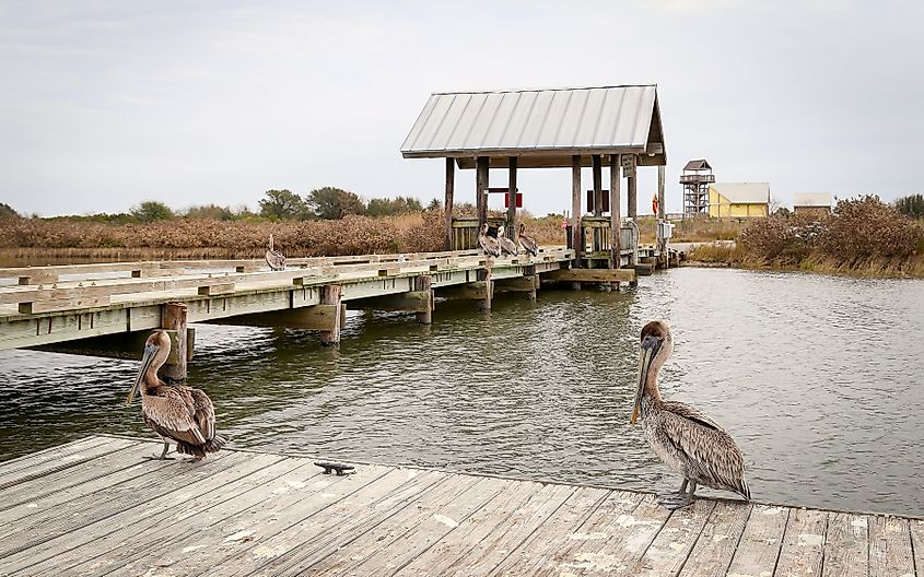 Des pélicans bruns se trouvent sur le quai de pêche du parc national de Grand Isle. Crédit image Wirestock Creators via Shutterstock