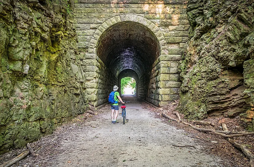 Cycliste au tunnel MKT sur Katy Trail à Rocheport, Missouri.
