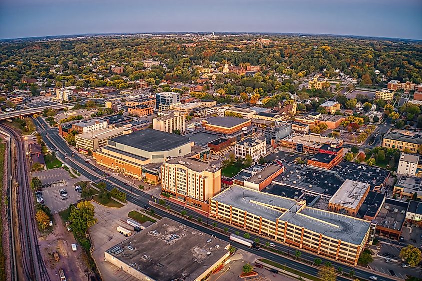 Vue aérienne de Mankato, Minnesota, au crépuscule.