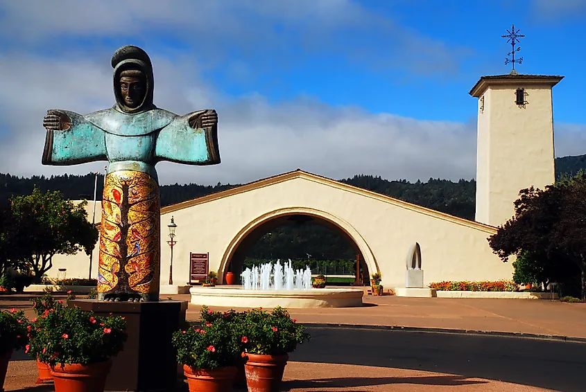 Une statue de Saint François orne la cour avant d'un domaine viticole à St, Helena, en Californie. Crédit image : James Kirkikis / Shutterstock.com.