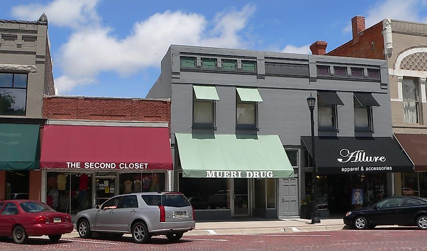 Bâtiments sur la 13ème rue au centre-ville de Columbus, Nebraska. Crédit d'image duckeesue via Shutterstock
