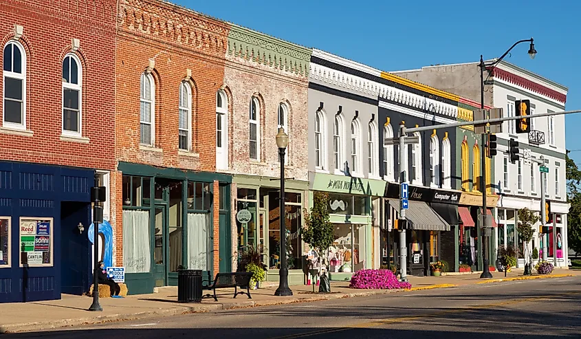 Vieux bâtiments en briques colorés et devantures de magasins dans le centre-ville de Princeton, Illinois. Crédit éditorial : Eddie J. Rodriquez / Shutterstock.com