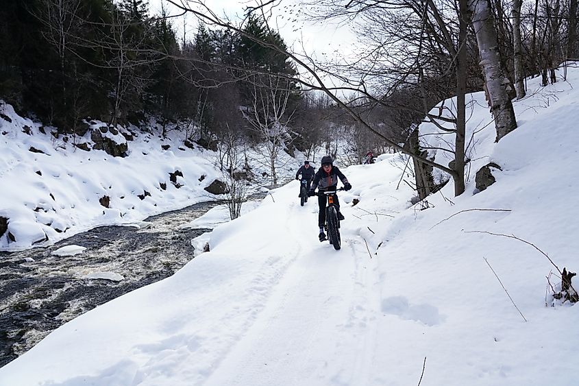Les gens profitent d’une balade à vélo au bord de la rivière en hiver à Merrill, Wisconsin. Crédit éditorial : Aaron de L.A. Photography / Shutterstock.com.