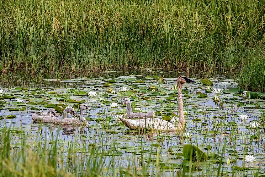 Cygne trompette et ses bébés cygnets à Phantom Lake, réserve faunique de l'État de Crex Meadows, Grantsburg, Wisconsin.