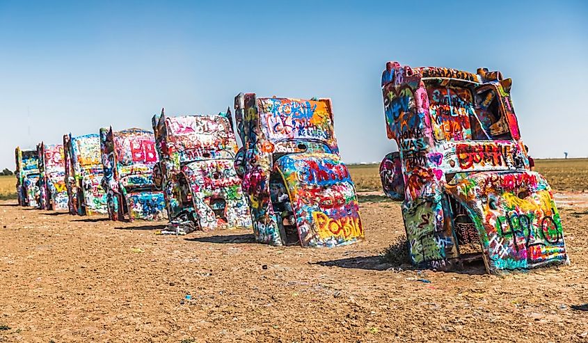 Cadillac Ranch, situé le long de la I-40 (route 66), est une sculpture d'art public représentant des Cadillac antiques enterrées à piquer dans un champ. Crédit image YuniqueB via Shutterstock
