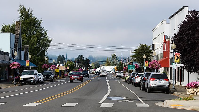 Trafic circulant le long de Fir Avenue dans le centre-ville de Reedsport, Oregon, via Ian Dewar Photography / Shutterstock.com
