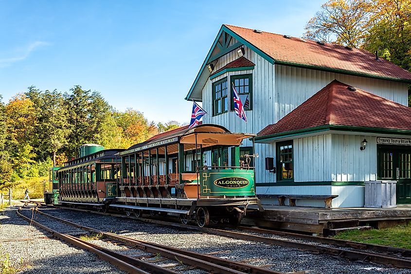 La station Rotary Village et le train Portage Flyer, qui font partie du Muskoka Heritage Place à Huntsville. Crédit éditorial : Gilberto Mesquita / Shutterstock.com