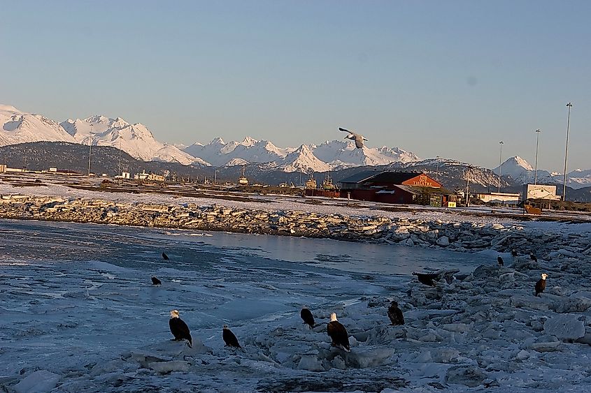 Pygargues à tête blanche à Homer, en Alaska. Par Carl Chapman CC BY 2.0,Wikimédia Commons.