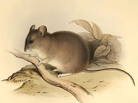 Illustration de l’insaisissable souris à oreilles à croupion jaune. Par Bell, Thomas ; Darwin, Charles ; Gould, Elizabeth; Gould, John ; Owen, Richard ; Waterhouse, GR – https://darwin-online.org.uk/converted/published/1838_Zoology_F8/1838_Zoology_F8.5_fig038.jpg, domaine public,Wikimédia Commons.
