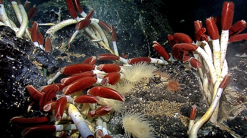 Les vers tubicoles sont généralement longs, atteignant une longueur moyenne de 7 pieds (2,1 m), avec un mince tube blanc coiffé d'un panache rouge qui piège les particules de nutriments de l'eau environnante. Ces vers sessiles (immobiles) ne mangent pas et ne produisent pas de déchets, ils s'attachent donc aux surfaces où ils sont uniquement entretenus par les réactions symbiotiques des bactéries résidentes d'un évent hydrothermal. C’est cette relation qui leur permet de prospérer – c’est l’une des espèces animales à la croissance la plus rapide – dans les profondeurs arides de la mer. Mais cette dépendance aux bactéries est à la fois une bénédiction et une malédiction, car les sources hydrothermales sont parfois de courte durée. Lorsque le jet d’eau riche en minéraux, indispensable à la vie, s’arrête, les vers tubicoles meurent presque immédiatement.