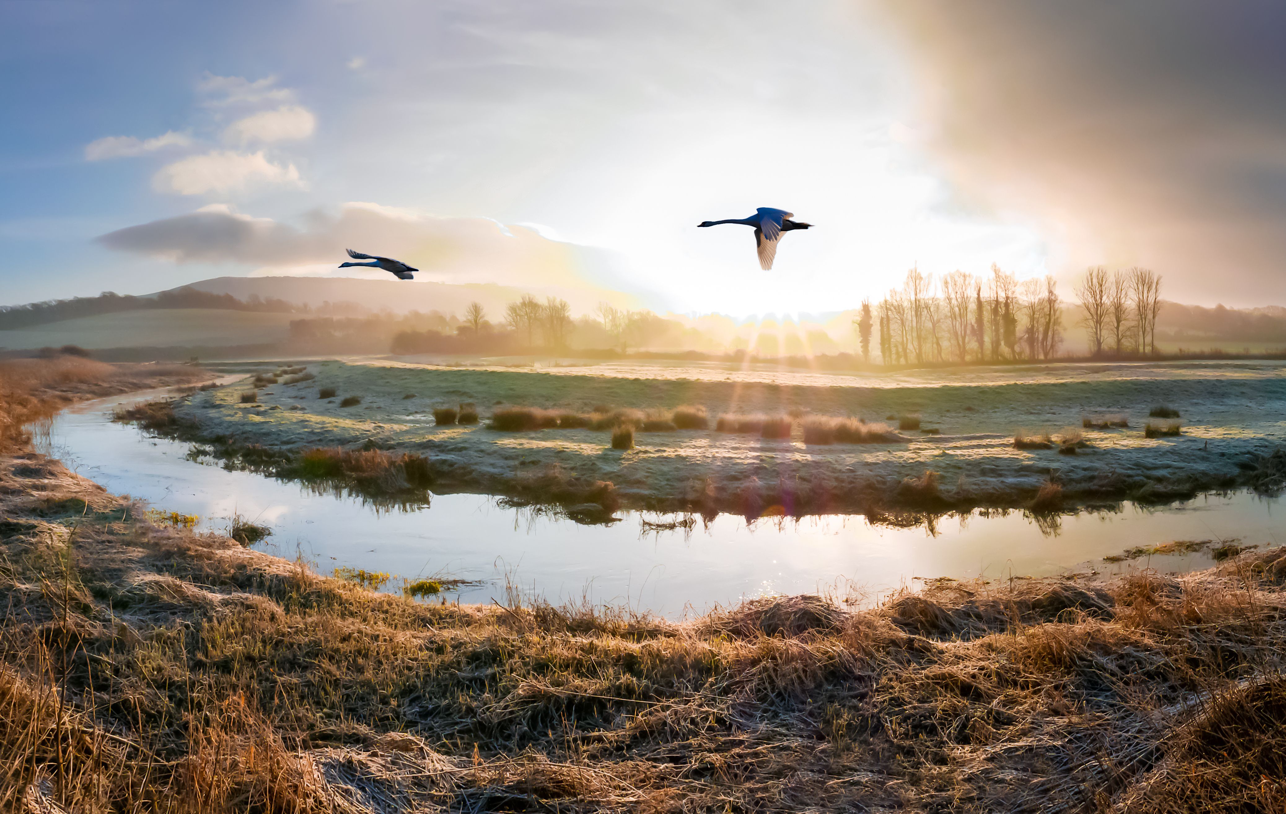 Cygnes survolant la rivière Cuckmere © James LePage/Shutterstock