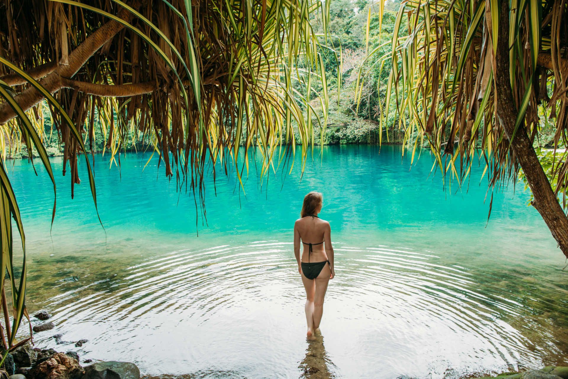 Ce magnifique lagon est entouré de hautes falaises et de forêts qui donnent une teinte vert foncé aux profondeurs sensiblement turquoise. L’effet global est très proche d’une carte postale. Le lagon est le résultat de plusieurs ruisseaux sous-marins descendant des montagnes. La baignade ici est sereine, avec une couche d'eau douce et froide recouvrant les vagues de la mer chaude en contrebas.