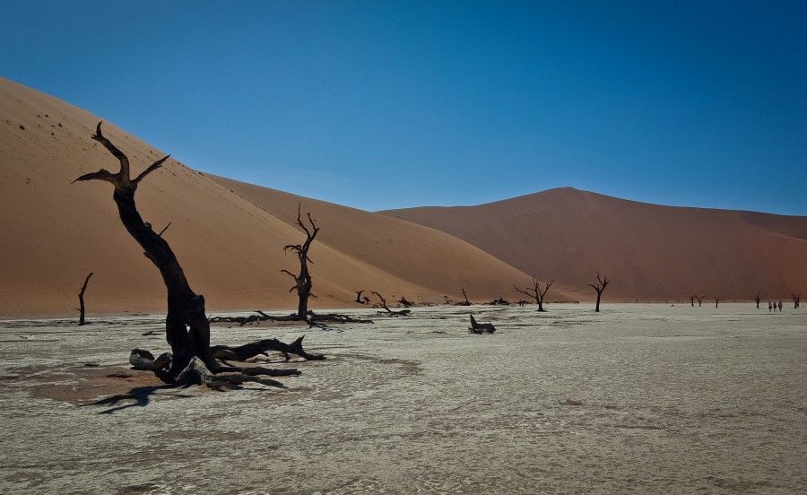 Sossusvlei (qui se traduit par « marais sans issue ») abrite l'emblématique Dead Vlei : autrefois un bassin luxuriant formé après la crue de la rivière Tsauchab. Il s'agit maintenant d'une cuvette d'argile et de minéraux desséchée et d'un blanc éclatant, parsemée d'arbres pétrifiés d'un noir de jais et entourée par les énormes dunes enflammées de la région. Un spectacle aussi saisissant et inquiétant en personne que sur les nombreuses photographies qui figurent dans les brochures touristiques de la Namibie.
