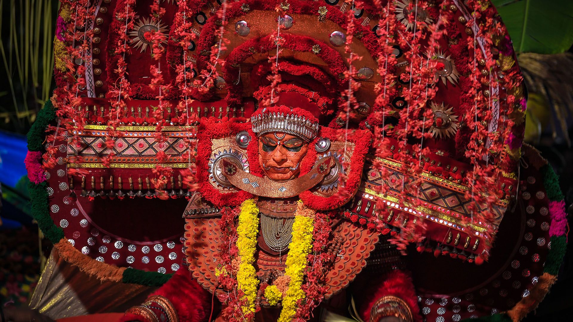 Les Theyyem sont des cérémonies villageoises dramatiques organisées dans tout le nord du Kerala, généralement entre octobre et mai. Ils sont exécutés au sanctuaire du village et les participants incarnent les dieux et les esprits célébrés. Chaque Theyyem possède ses propres costumes extraordinaires, notamment des peintures corporelles brillantes et de gigantesques coiffes richement décorées (mudi).