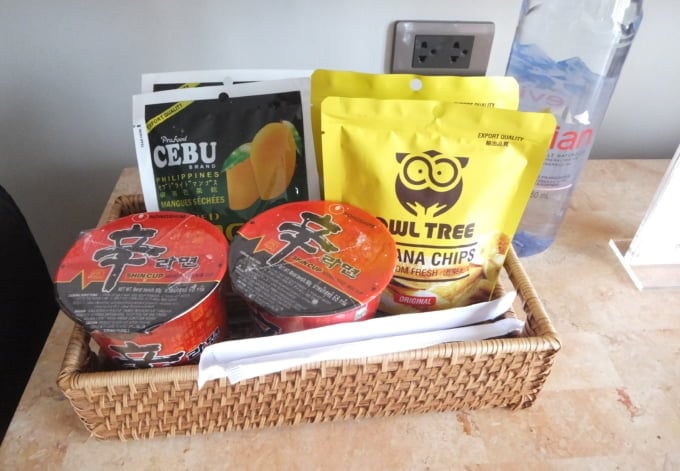 Directement sous le moniteur se trouvait un bureau sur lequel étaient placés des chips de banane, de la mangue séchée, une tasse de ramen coréenne et une bouteille de 1 250 ml d'eau minérale.