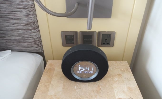 Il y a un réveil à côté du lit. Ça sonne une mélodie le matin. Il y a aussi une lumière et une prise au-dessus du lit.