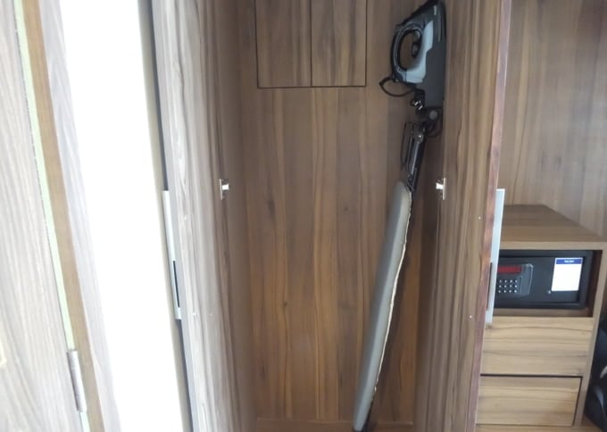 De l'autre côté, il y a un fer et une planche à repasser, un coffre-fort, des peignoirs (pour le nombre de personnes) et des cintres (12 pièces). La partie inférieure dispose également de chaussons et d'une balance, et peut être utilisée comme porte-bagages.