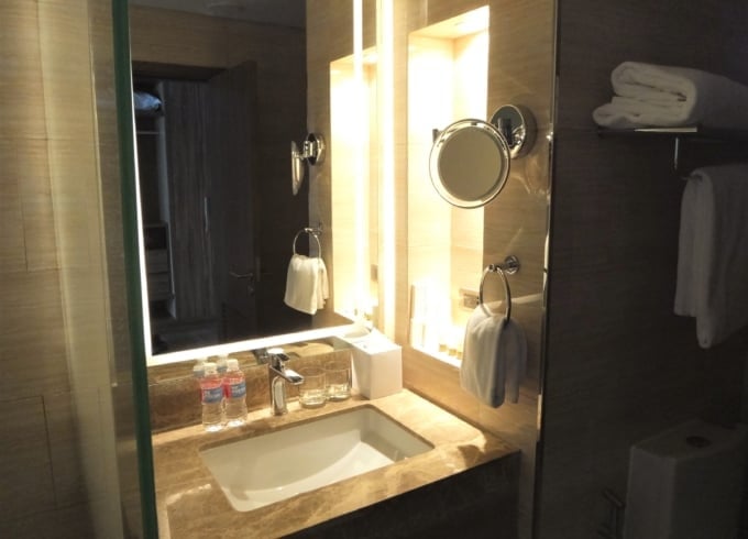 C'est l'évier. Il y a deux miroirs de tailles différentes, deux bouteilles d'eau minérale gratuites, deux tasses et une boîte à mouchoirs.