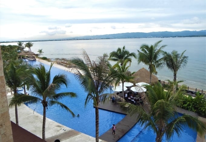 C'est la vue depuis la fenêtre et le balcon. Vous pouvez voir la piscine de l'hôtel, la baie de Magellan, l'île de Cebu et bien plus encore.