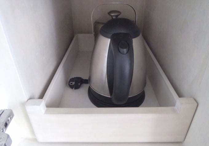 Il y a une bouilloire dans le tiroir sous le bureau.