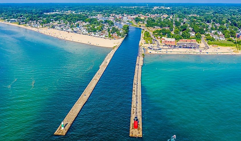 Vue aérienne du phare de South Haven sur le lac Michigan.