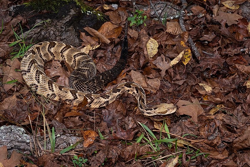 Serpent à sonnettes des bois glissant à travers les feuilles.