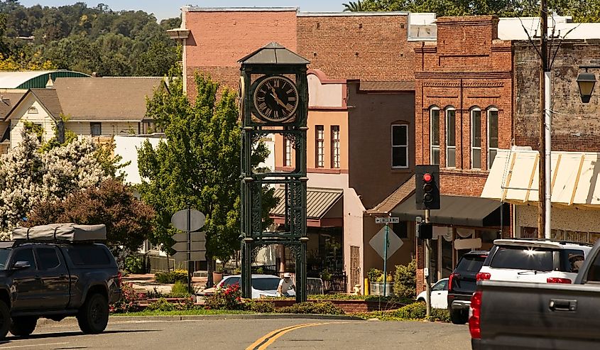 La lumière du matin brille sur le centre-ville historique d'Auburn, en Californie.