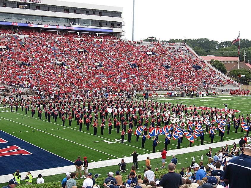 Ole' Miss Band se produisant au stade Vaught-Hemingway, Université du Mississippi (Ole Miss), Oxford, Mississippi. Crédit image :Ken Lundvia Flickr.com.