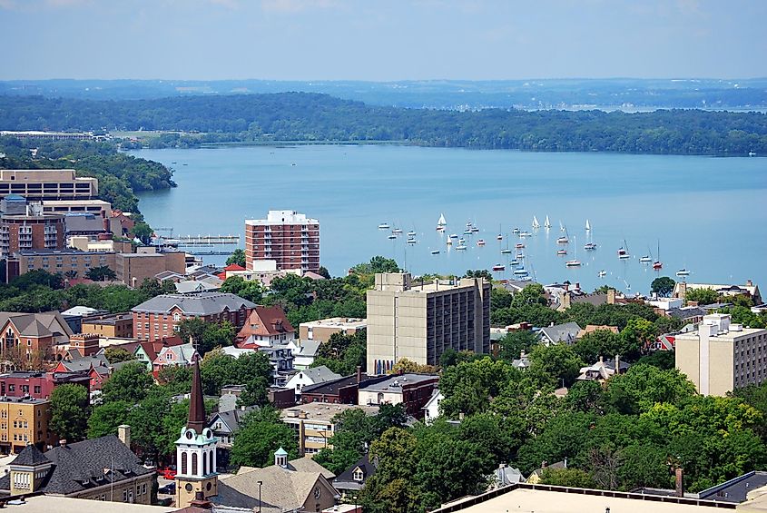 Madison est stratégiquement située sur un isthme entre le lac Mendota au nord et le lac Monona au sud, avec les lacs Waubesa et Kegonsa non loin au sud-est. Ce cadre géographique unique offre aux résidents et aux visiteurs un accès et des activités étendus au bord de l’eau. Les lacs sont un élément central de l'identité de Madison, offrant des possibilités de navigation de plaisance, de pêche et de patinage sur glace en hiver, qui constituent des attractions majeures à la fois pour la population étudiante et pour la communauté au sens large.