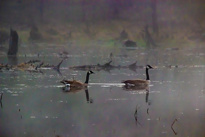 Oies nageant dans un plan d'eau lors d'une matinée brumeuse au parc national Harriman, Idaho.