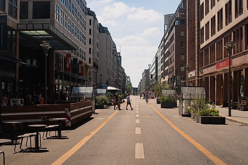 Vue sur la Friedrichstraße jusqu'à l'entrée de la station U-Bahn Stadtmitte à Berlin. Source : Wikimédia/Flocons de neige