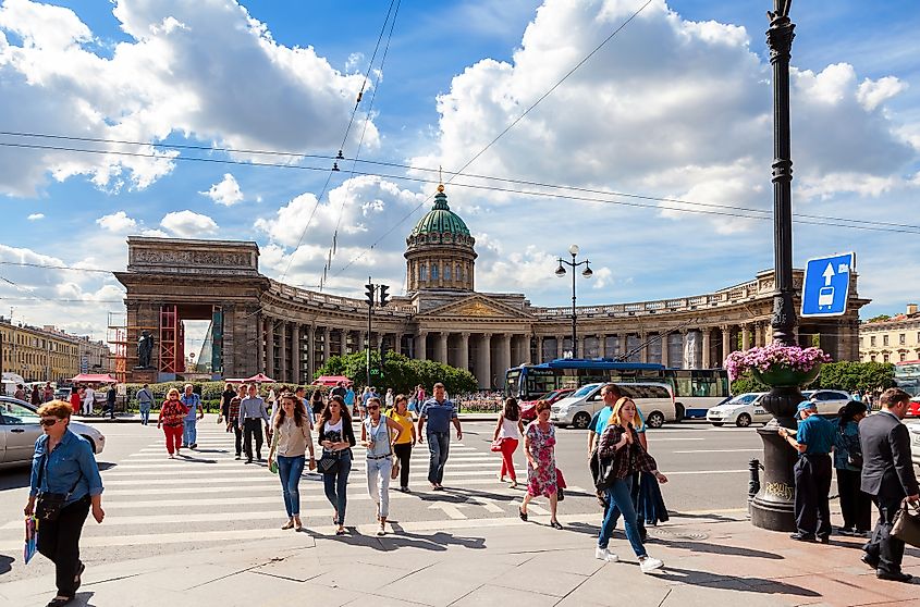 Les piétons passent devant la perspective Nevski par temps ensoleillé d'été, près de la cathédrale de Kazan à Saint-Pétersbourg. Crédit éditorial : FotograFFF / Shutterstock.com