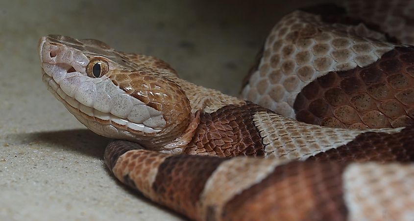Également connues sous le nom de cottonmouths, ces vipères se trouvent dans la partie sud des États-Unis. Ils tirent leur nom de la couleur blanche de leur bouche affichée lorsqu'ils sont menacés. Ils aiment vivre près de l’eau et des zones humides marécageuses à proximité. Ils contiennent un venin qui provoque des lésions tissulaires extrêmes et une dégénérescence des organes. Il empêche également le sang de coaguler correctement. Ils vivent généralement d’un régime composé de petits mammifères, de grenouilles et de lézards. Ils sont extrêmement territoriaux mais ne sont généralement pas agressifs à moins d'être provoqués. Soyez prudent lorsque vous voyagez là où ils sont connus pour vivre.