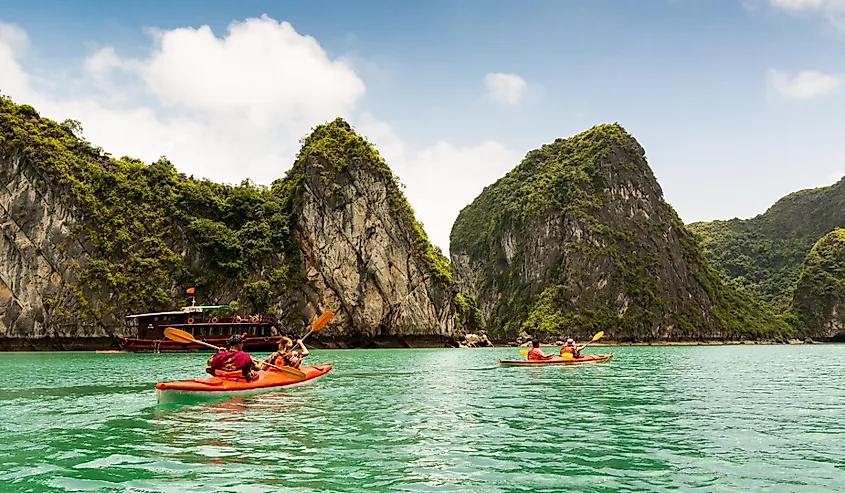 Deux kayaks pagayant dans la baie d'Ha Long, au Vietnam.