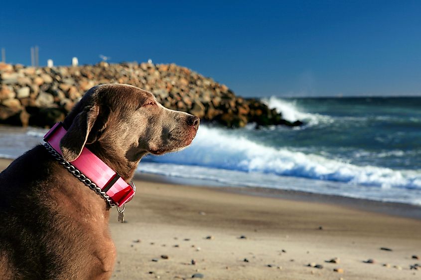 Un chien est assis sur la plage de Westerly, Rhode Island.