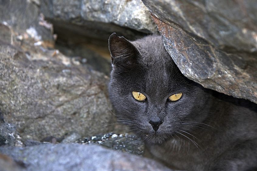 Chat sauvage noir abrité par une corniche rocheuse dans une forêt
