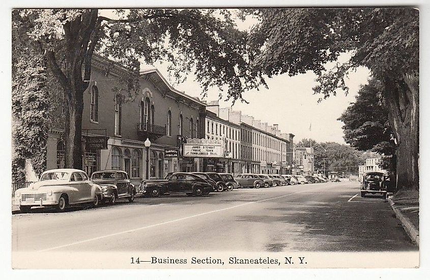 Les Skaneateles, New York, quartier des affaires à la fin des années 1930 ou dans les années 1940. Par Pdsinger, CC By-sa 3.0, via Wikimedia Commons