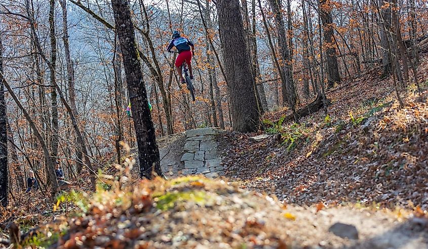 Saut en VTT dans les bois, Eureka Springs, Arkansas. Crédit image Iron Realm via Shutterstock